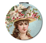 Matte black metal casing with matte black PU on both sides, and a hinged lid featuring a botanical print. Inside has a regular mirror on one side and a double magnifying mirror on the other.