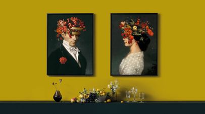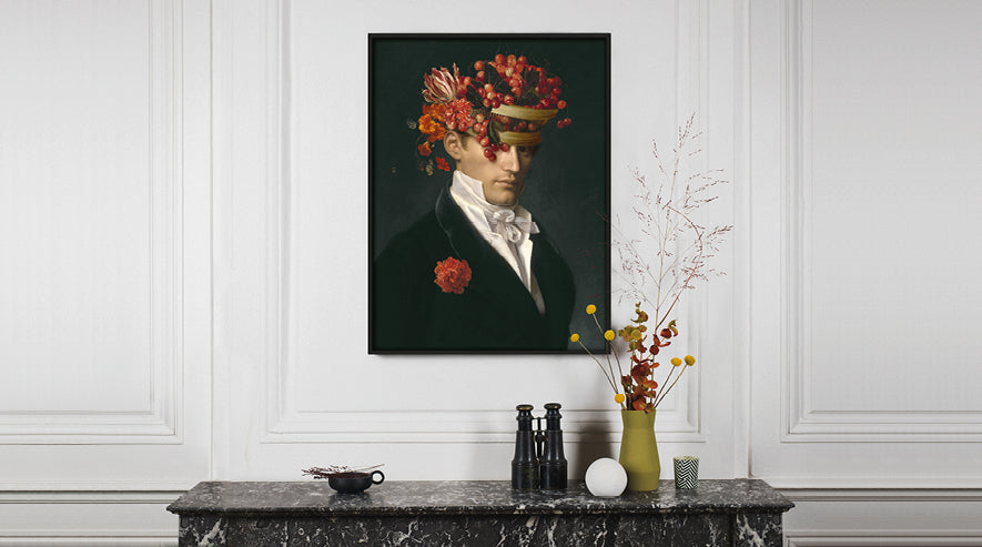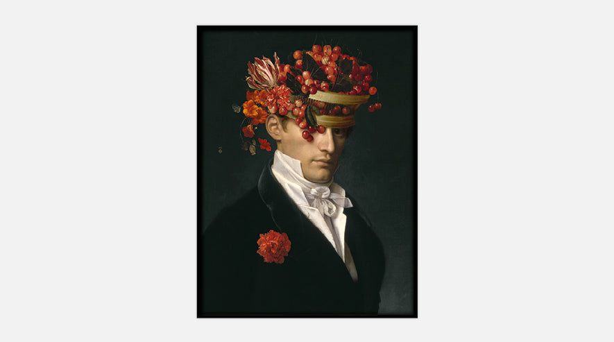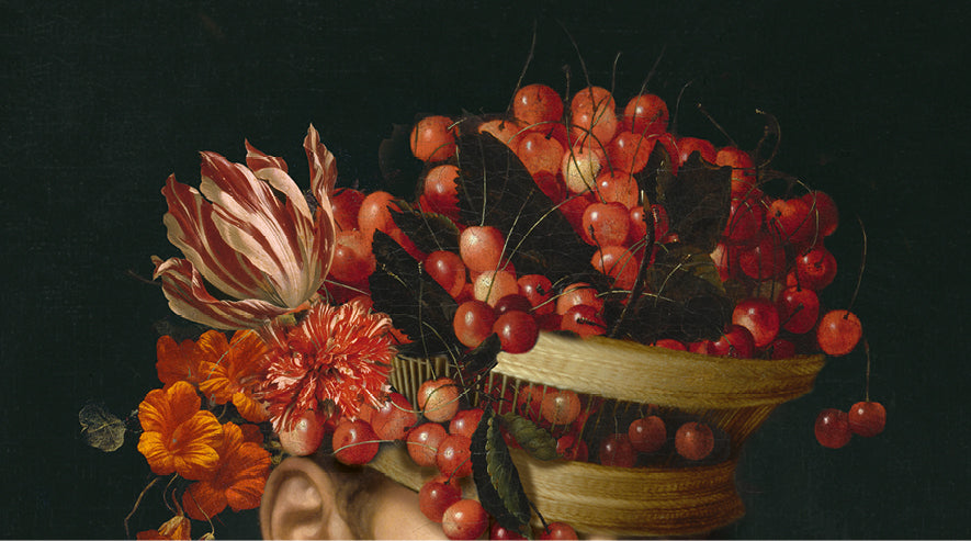 The characters disguise themselves, seduce each other and exchange glances. Their heads covered with unusual compositions of fruit and flowers, each one is only half revealed. A toque of tulips and bigarreaux, a lemon and daffodil boater, mounted on an apricot branch and gooseberries as ear pendants.