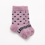 Thistle - Plummy pink with black polka dots. Merino wool ribbed crew socks for babies.