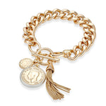 Crafted with care, fashion curb link bracelet with two tone coin and tassel. Gold colour. Tassel can be removed if you prefer.