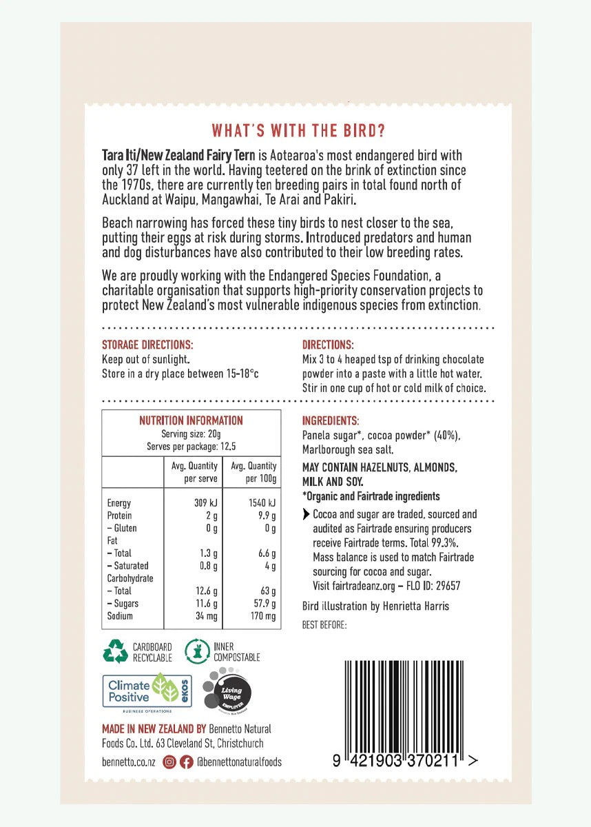 Blended in Christchurch, this premium organic hot chocolate powder is characterised by a high cocoa intensity and a lower sugar content than standard hot chocolate powders. By using panela sugar, this product is refined sugar-free.